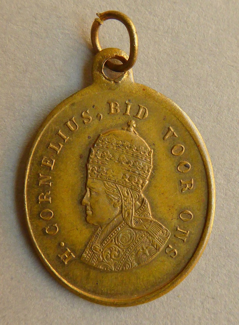 Devotiepenning met borstbeeld paus en "H. Cornelius, bid voor ons", kz. hoorn