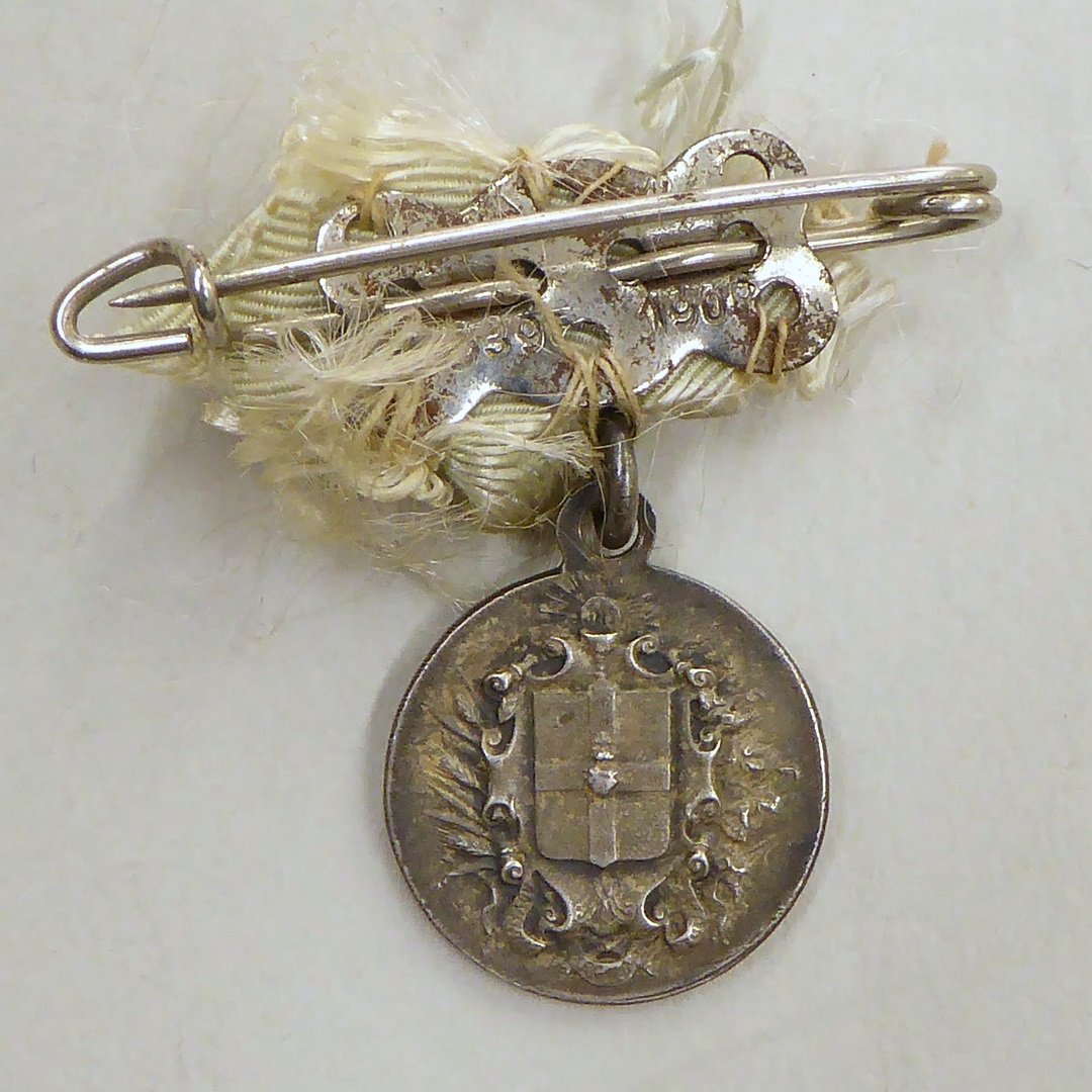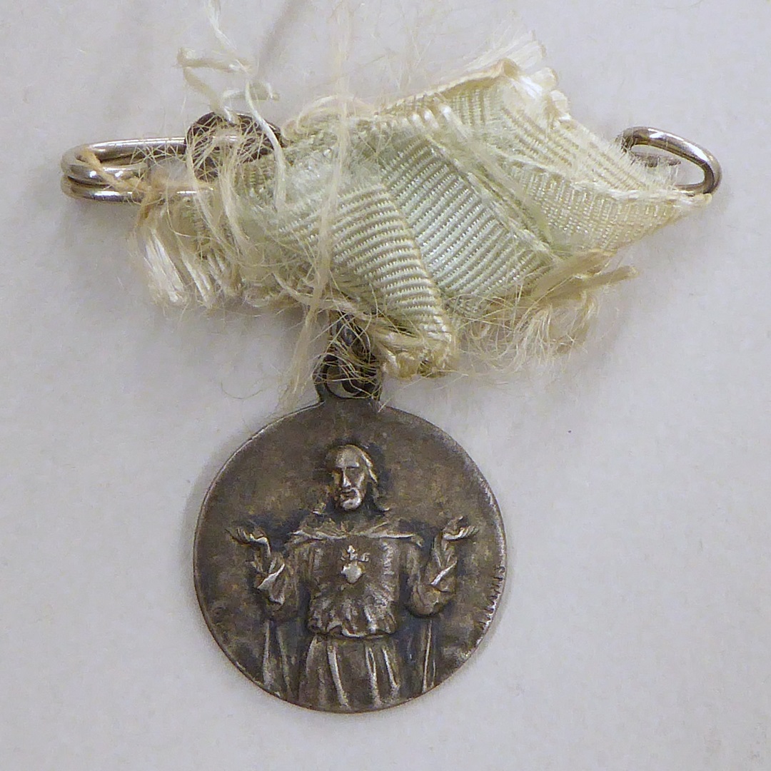Devotiepenning aan speld met blauw strikje met H. Hart Christus, kz. wapenschild