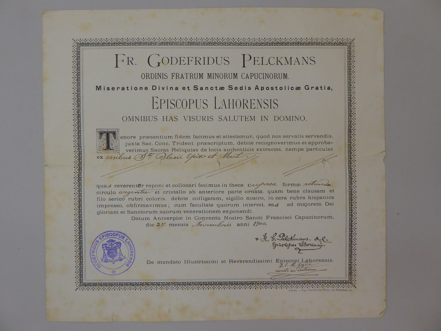 Echtheidsverklaring bij RMCC v301.4a met "Fr. Godefridus Pelckmans ..."