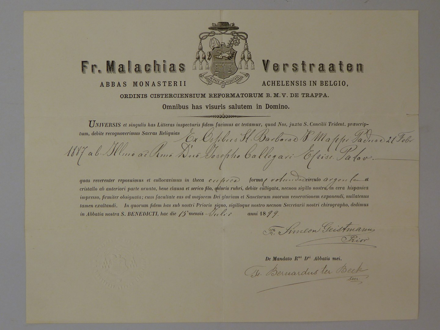 Echtheidsverklaring bij RMCC v301.7a met "Fr. Malachias Verstraaten ..."
