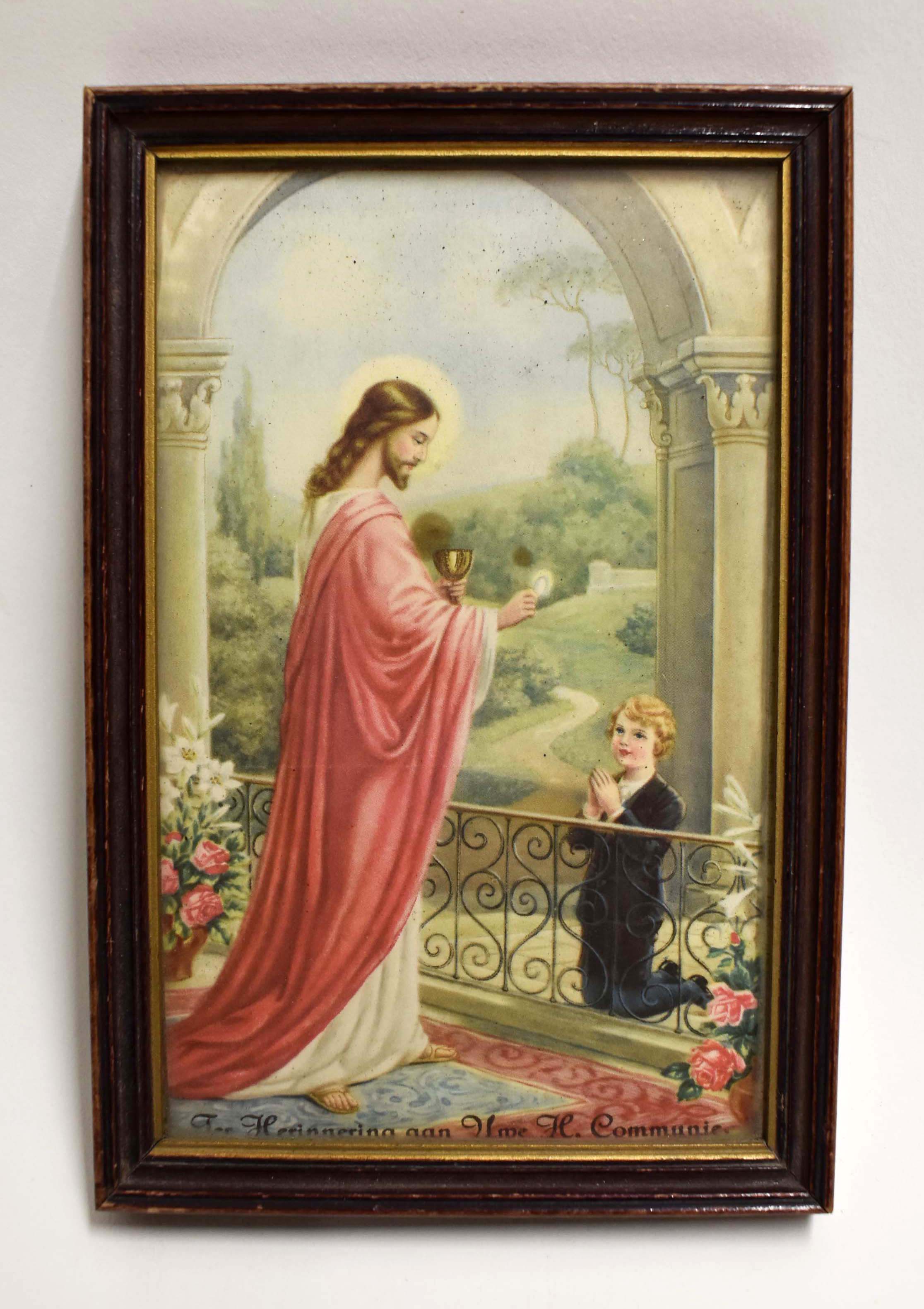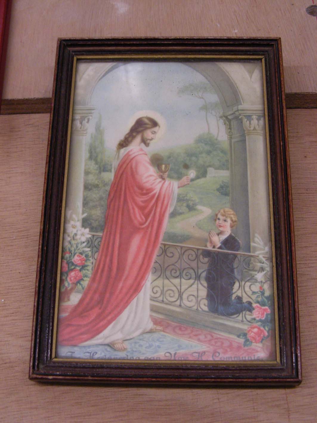 Eerste H. Communieprentje in lijst: Christus reikt jongen eerste communie uit