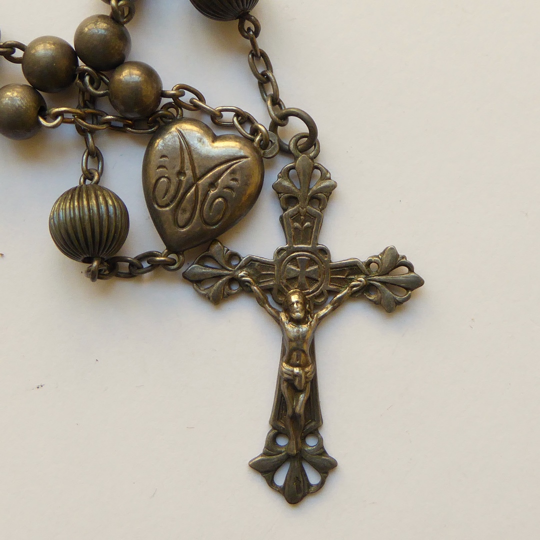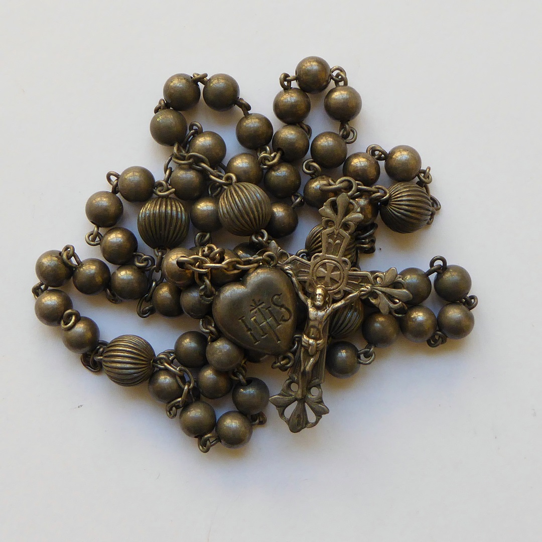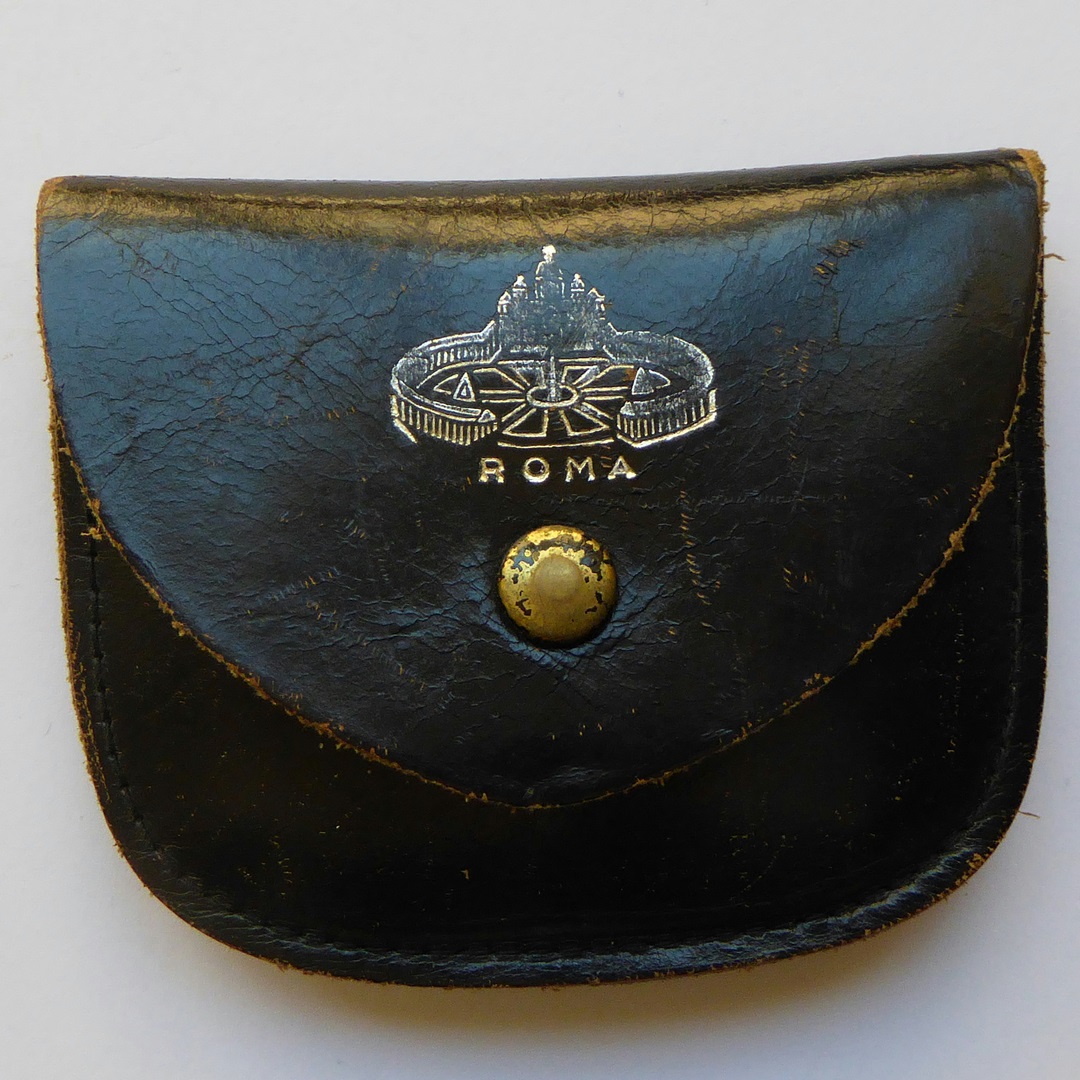 Metalen rozenkrans met zilveren kruisje, in zwart leren etuitje met St. Pieter en "Roma"