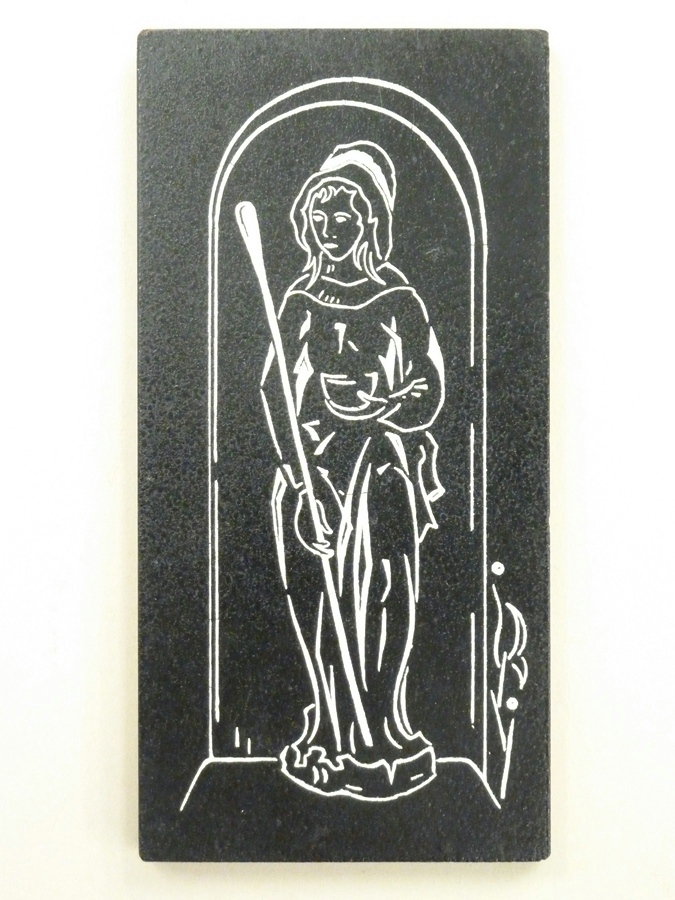 Geertetegel: op zwarte ondergrond Gertrudis van Nijvel met staf en nap