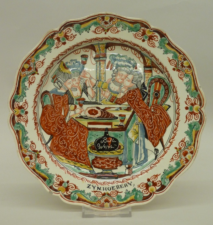 Bord met tafereel uit 'de verloren zoon' waarop "Zyn hoerery", met verloren zoon en drie vrouwen