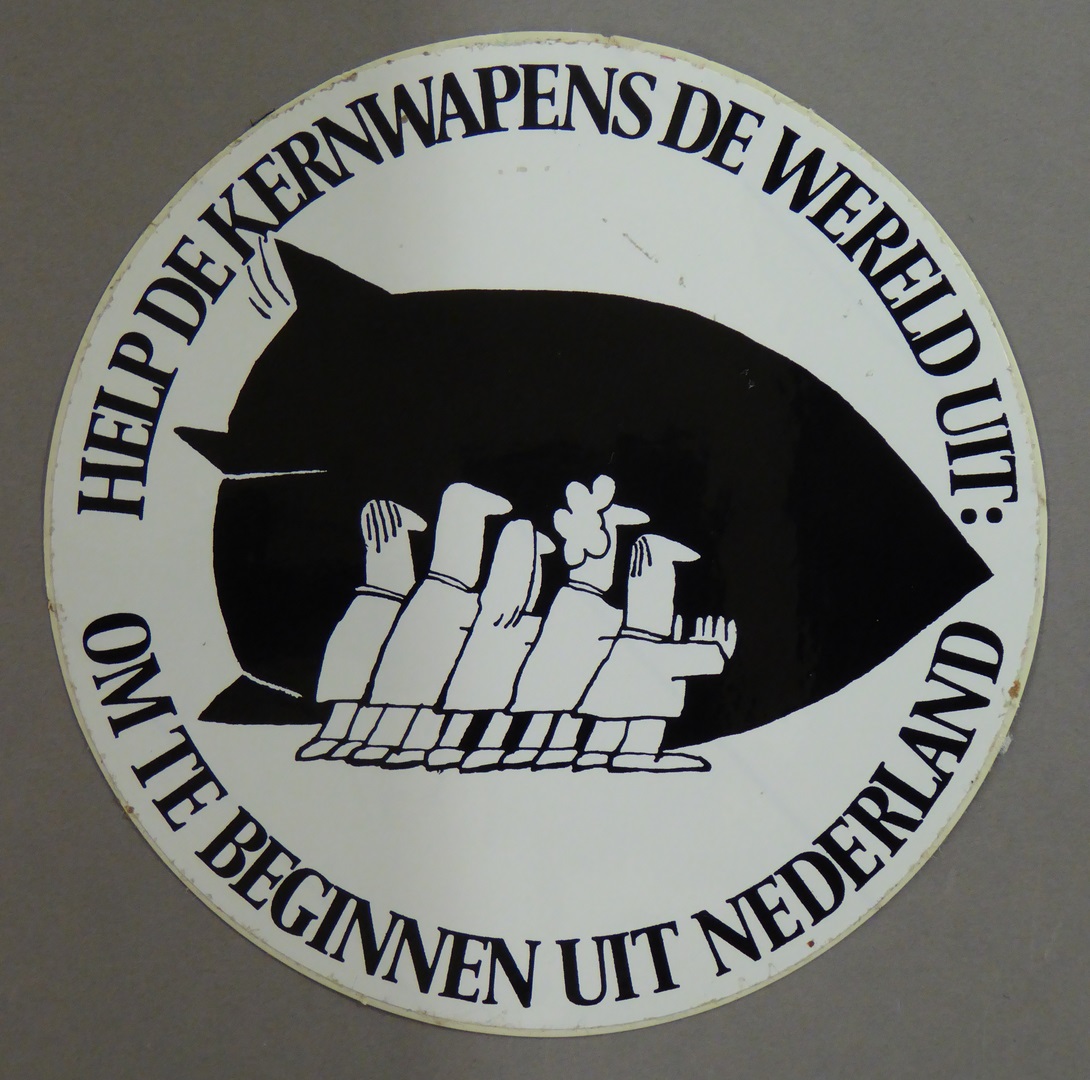Sticker "Help de kernwapens de wereld uit: om te beginnen uit Nederland", 5 mensen die bom wegduwen