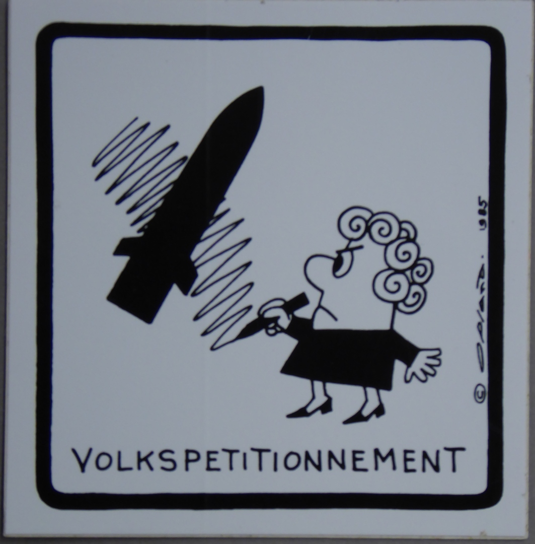 Witte sticker met "Volkspetitionnement" en met persoon die met pen door een bom krast