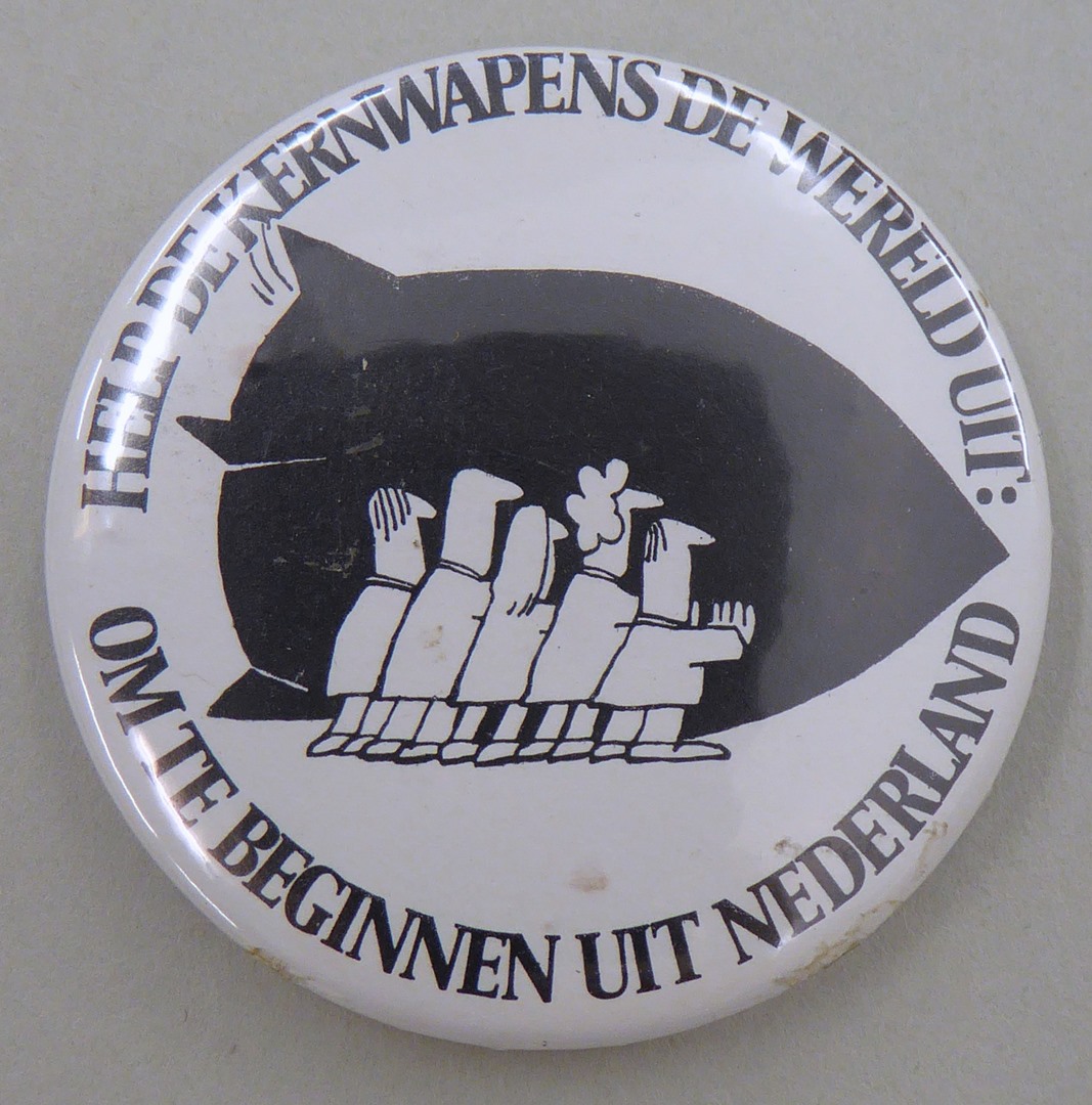 Button "Help de kernwapens de wereld uit: om te beginnen uit Nederland", 5 mensen die bom wegduwen