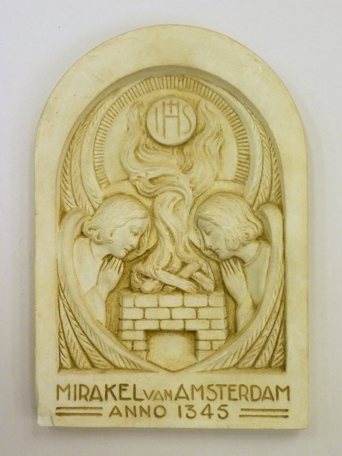 Boogvormig reliëf met twee figuren ten halve lijve, met "Mirakel van Amsterdam anno 1345"
