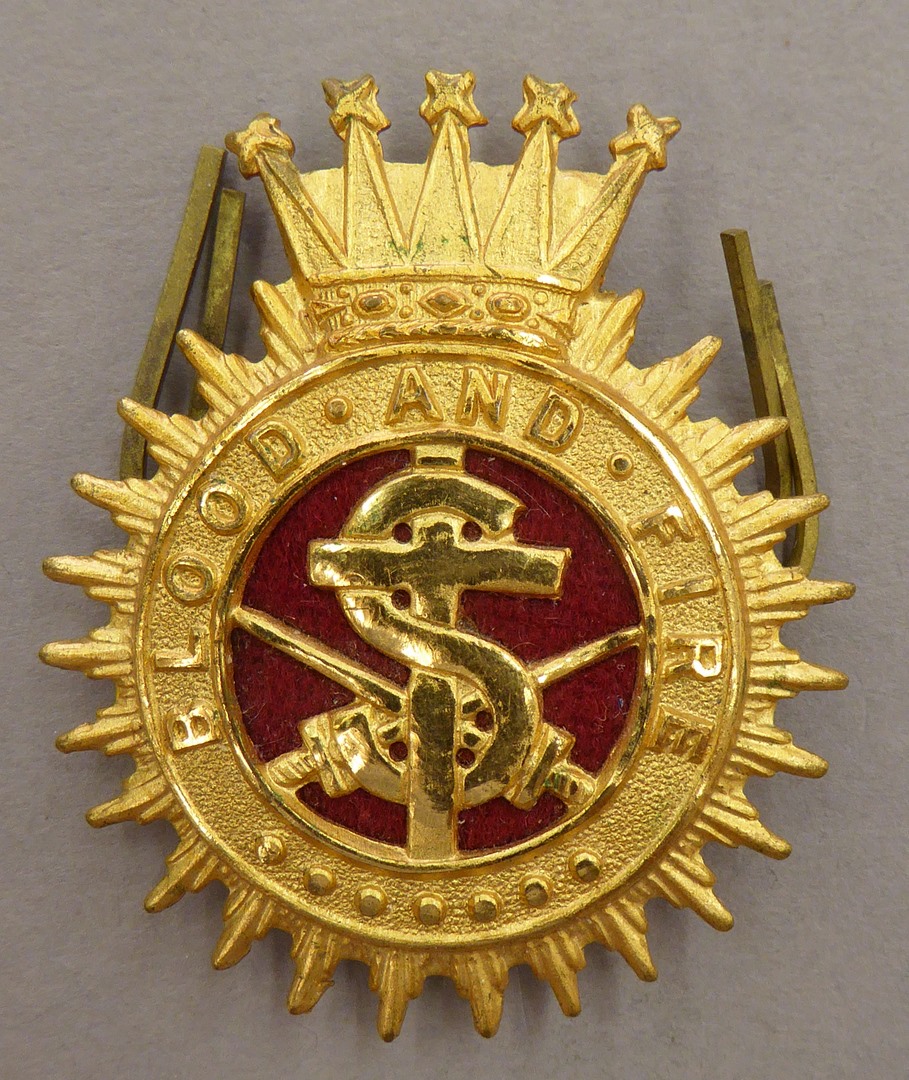 Leger des Heils: insigne, rond met kroon met "blood and fire" met kruis, S, twee degens