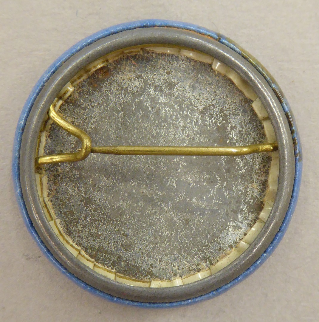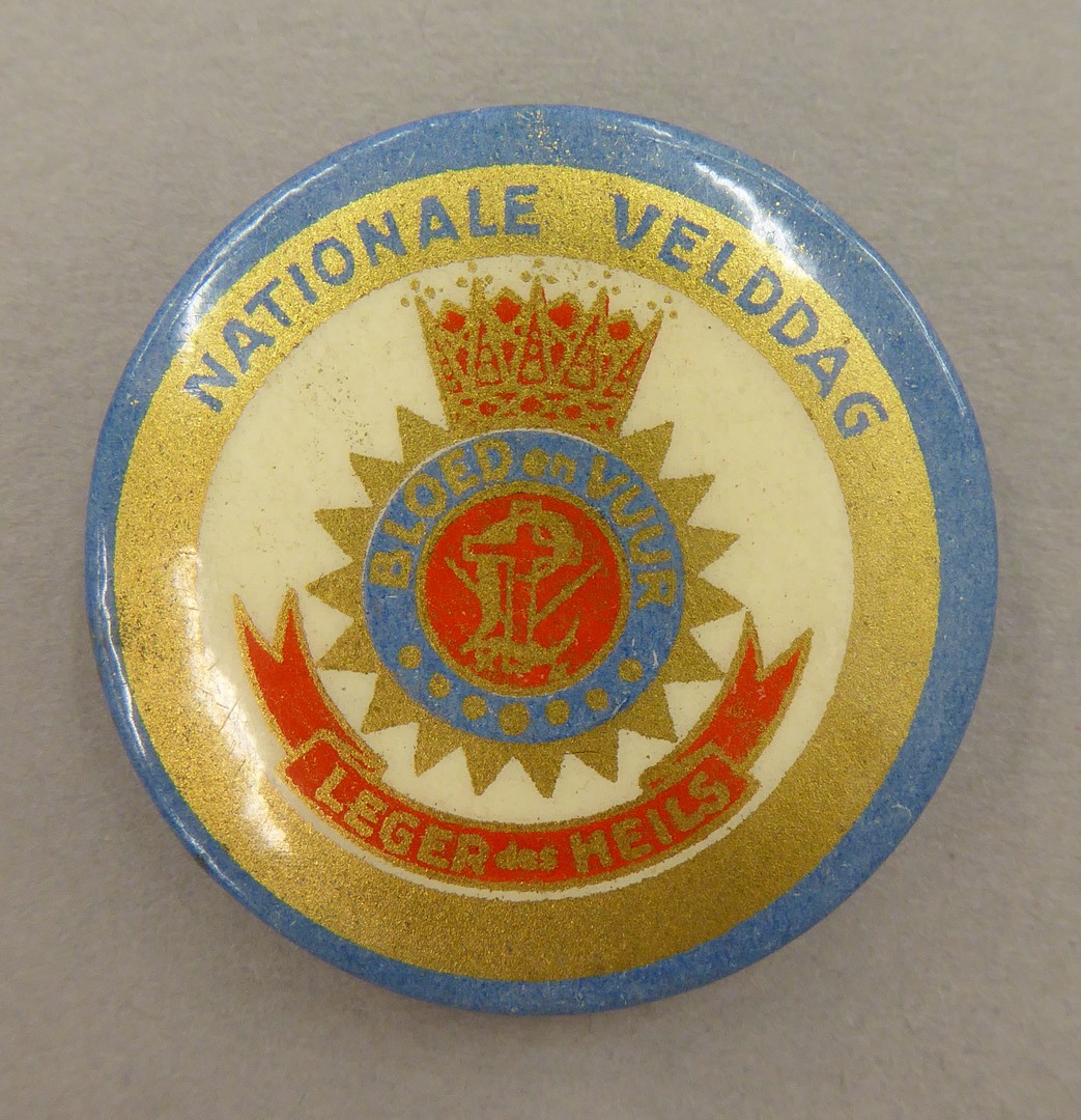 Leger des Heils: button met "nationale velddag" in blauw, wit, rood en goud