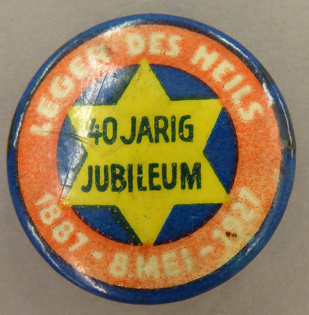 Leger des Heils: button, blauw met gele ster met "40 jarig jubileum", rode cirkel met "1887...1927"