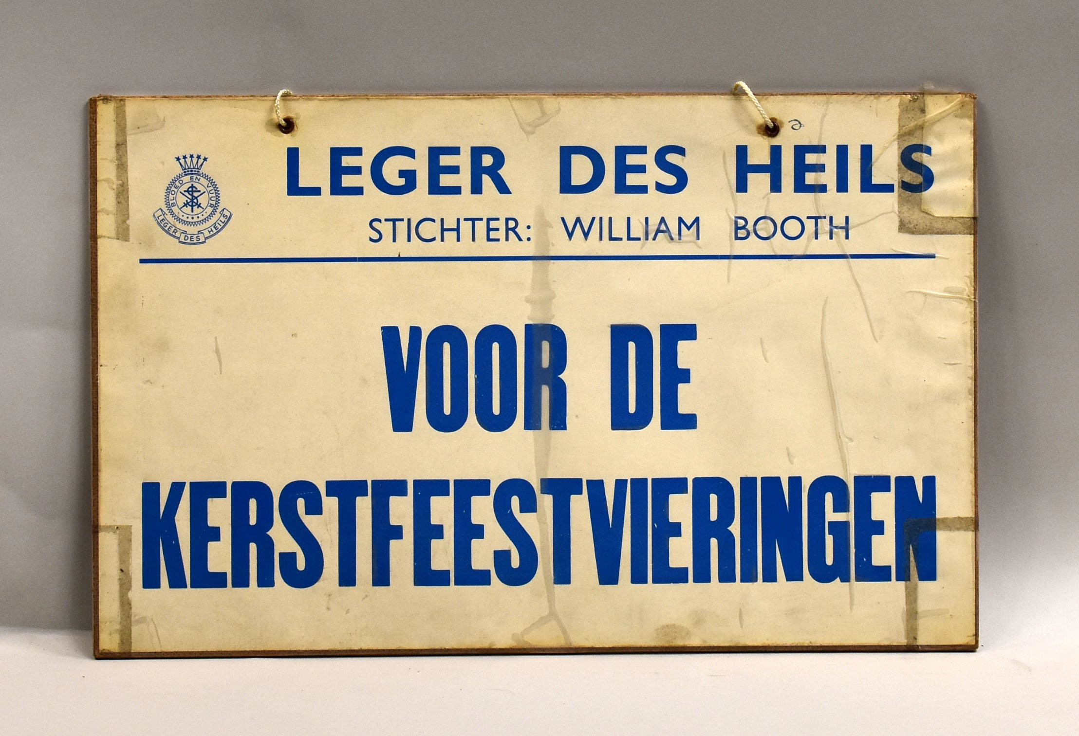 Wit bord met in blauwe letters "Leger des Heils. stichter William Booth. Voor de Kerstvieringen"