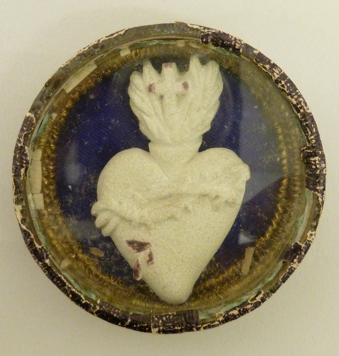 Heilig Hart met doornenkroon in zwart rond medaillon, aan achterkant rood papieren H. Hart