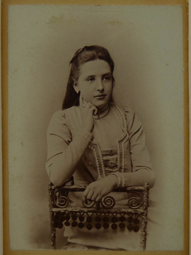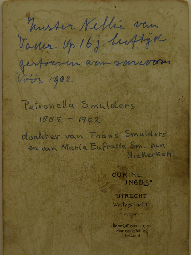 Portret ten halve lijve van Petronella Smulders zitend op een stoel met achterop geschreven tekst