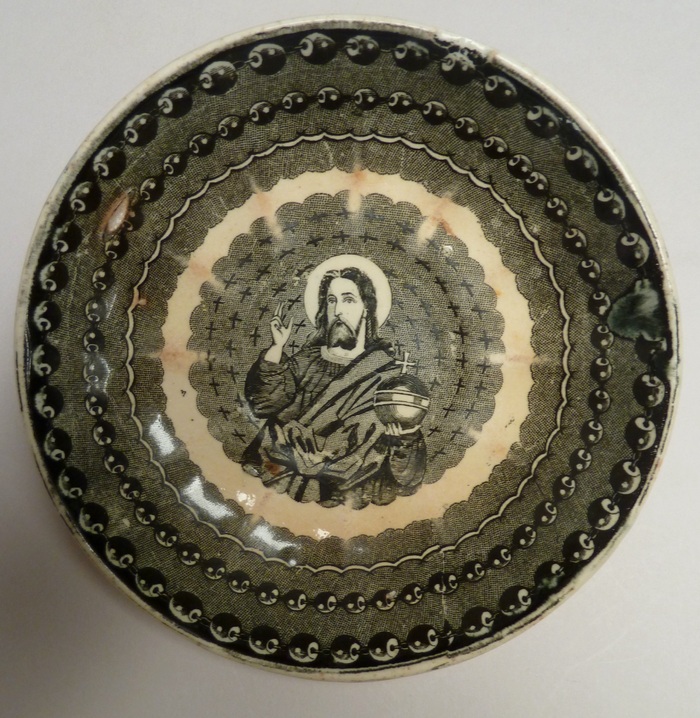 Schotel met Christus Salvator Mundi met wereldbol in linkerhand, in rand twee 'rozenkransen'