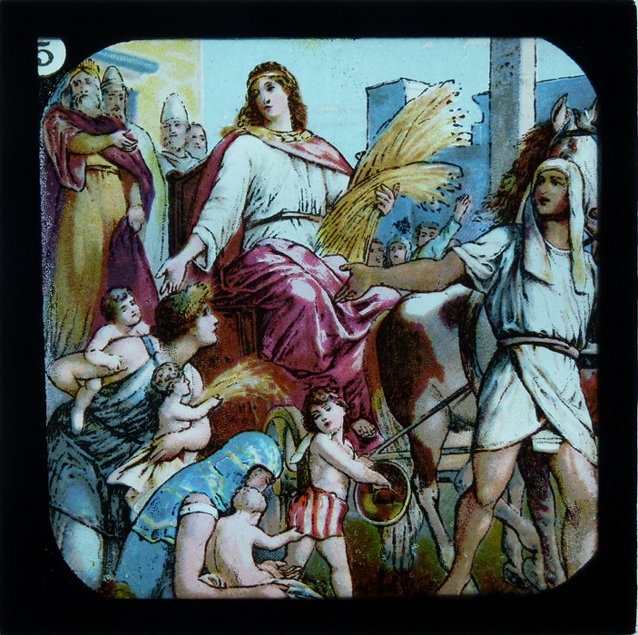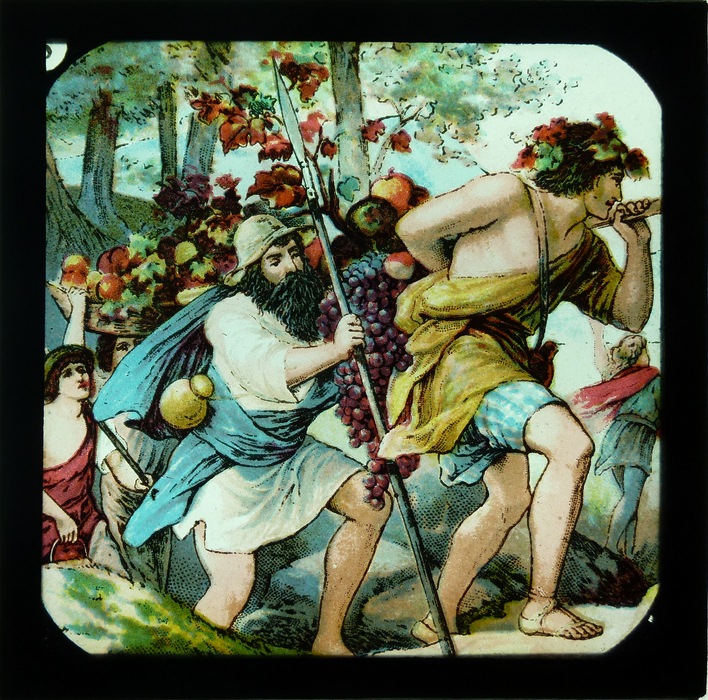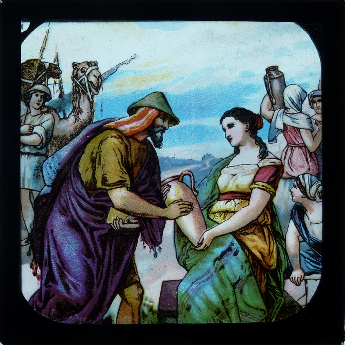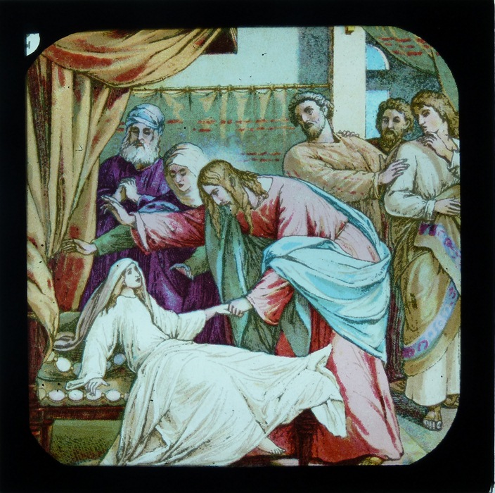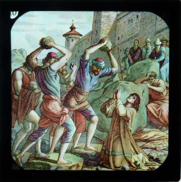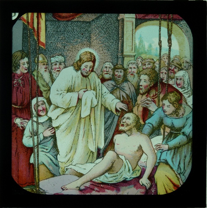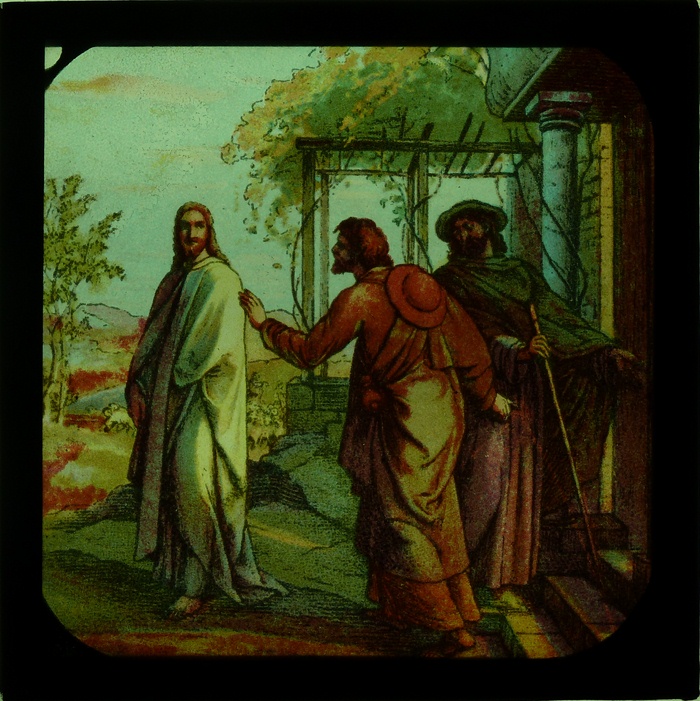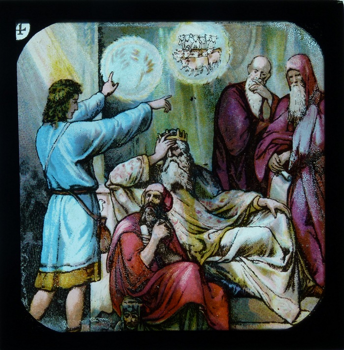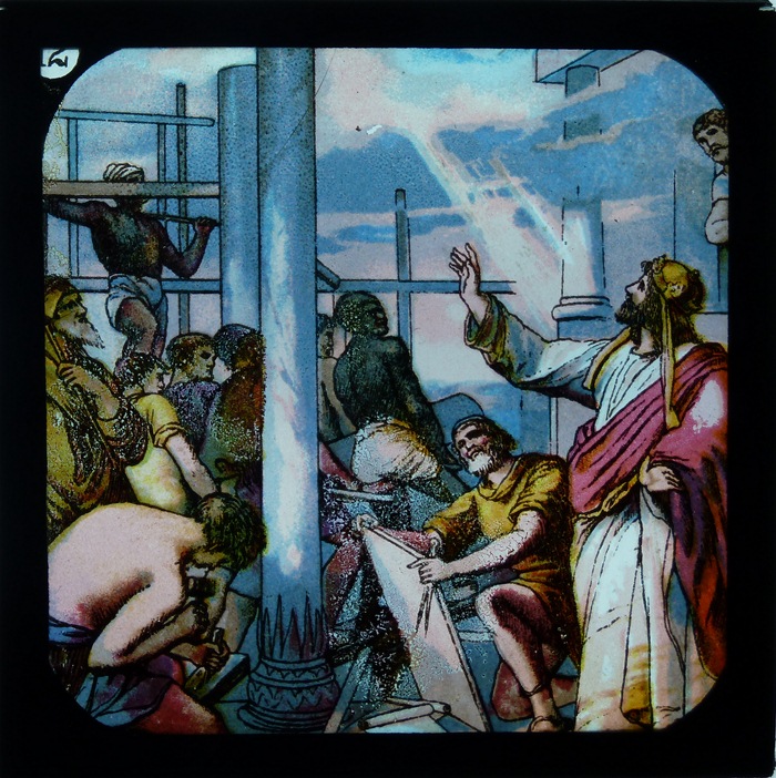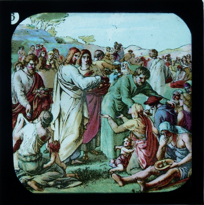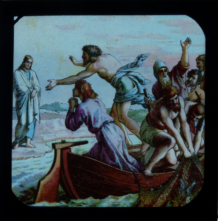 12 lantaarnplaatjes met scènes uit het Oude en Nieuwe testament, in sigarenkistje
