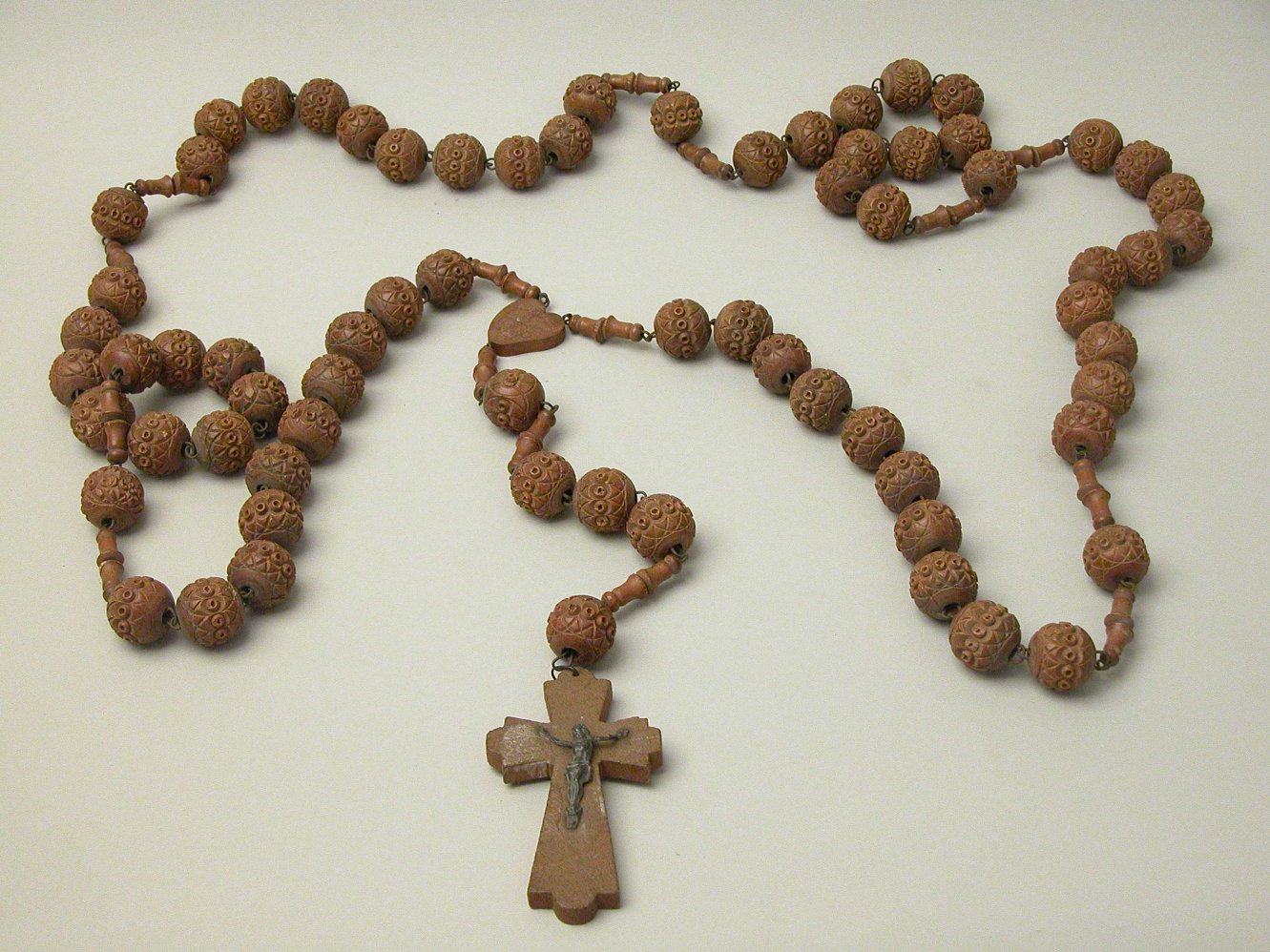 Rozenkrans van bruine kralen met "souvenir de N.D. de Lourdes" en kruis met "... de Kevelaer"
