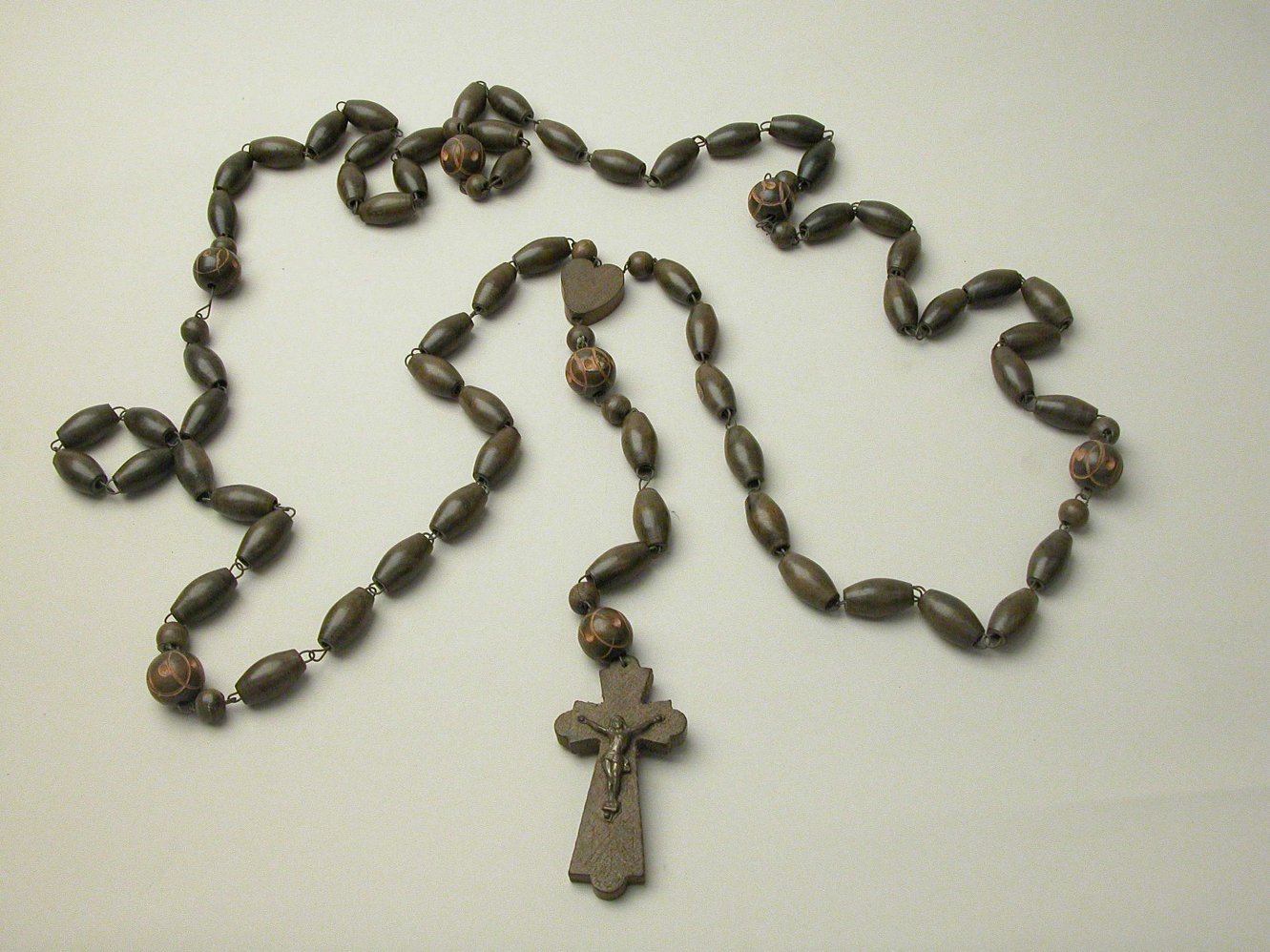 Rozenkrans van groene kralen met hart met "Coeur immacule de Marie protegez nous" en met kruis