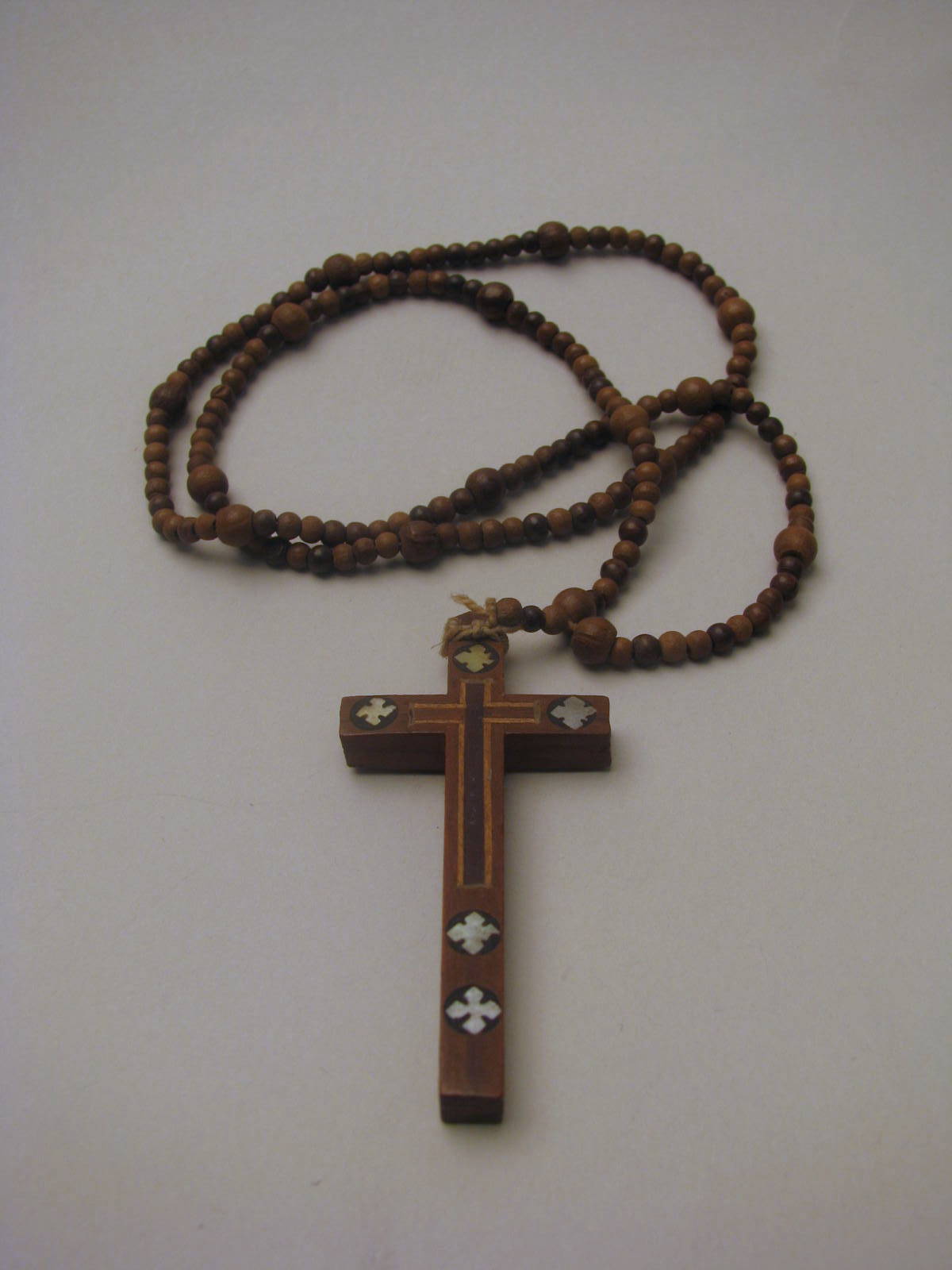 Rozenkrans van bruine kralen met bruin kruis ingelegd met parelmoer