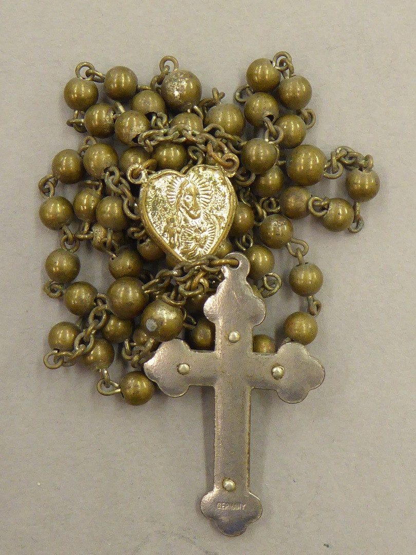 Rozenkrans van metalen kralen, hartje met Maria, kruis met wit ingelegd