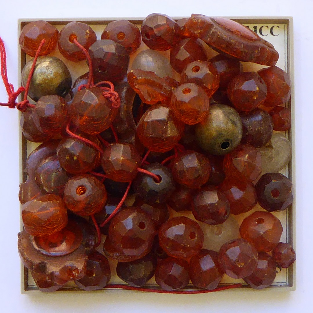 Rozenkrans van barnstenen, waarvan vijf ingezet met Arma Christi en tekst, ongeregen