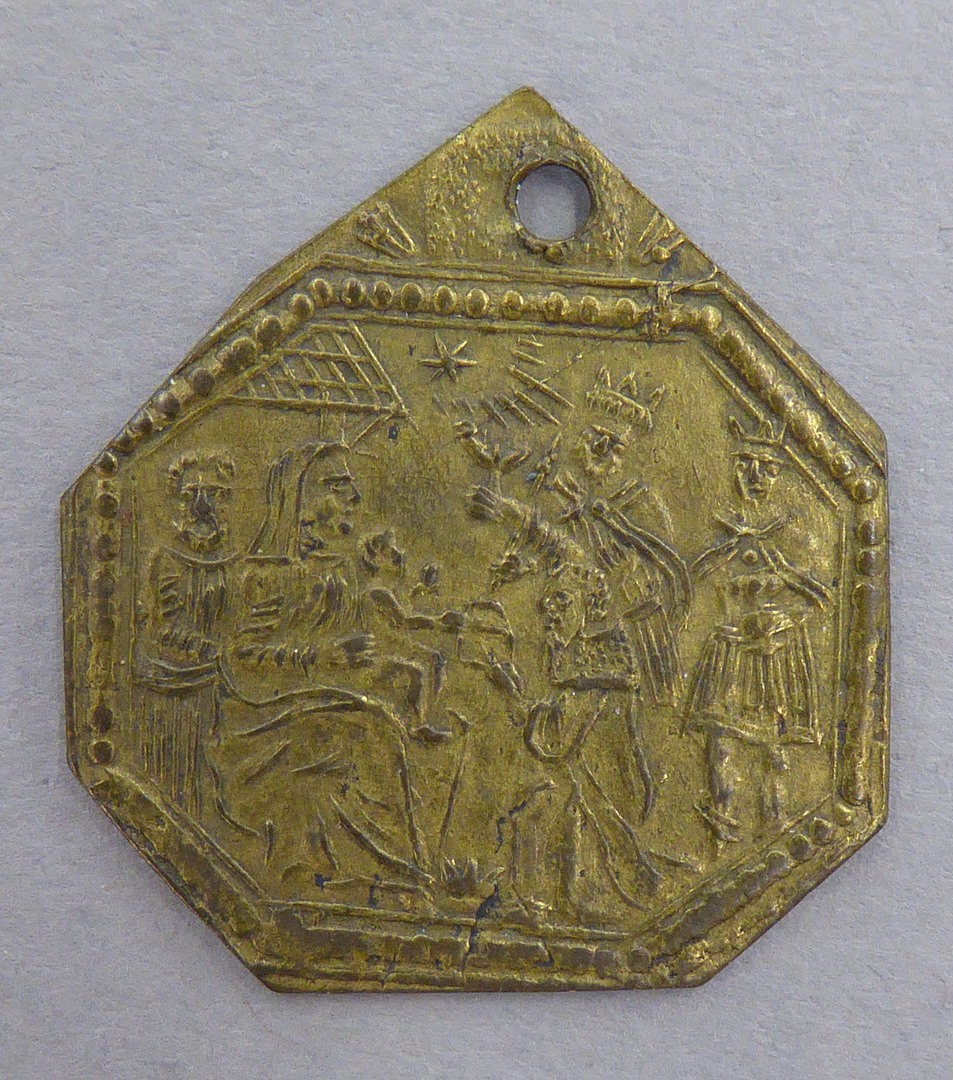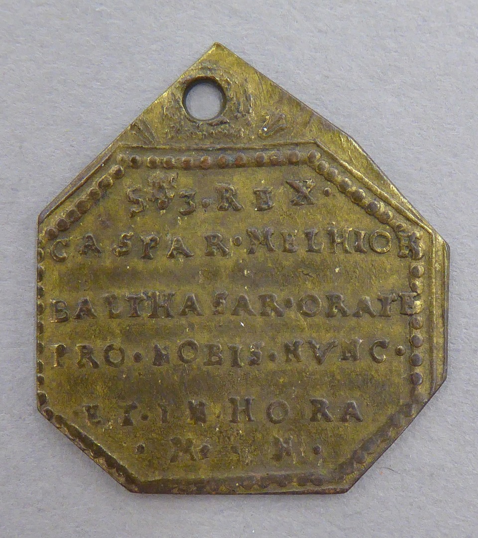 Hanger met aanbidding der drie koningen, op achterzijde met "S. 3 rex Caspar Melchior Balthasar orate pro nobis nunc et in hora m. n."