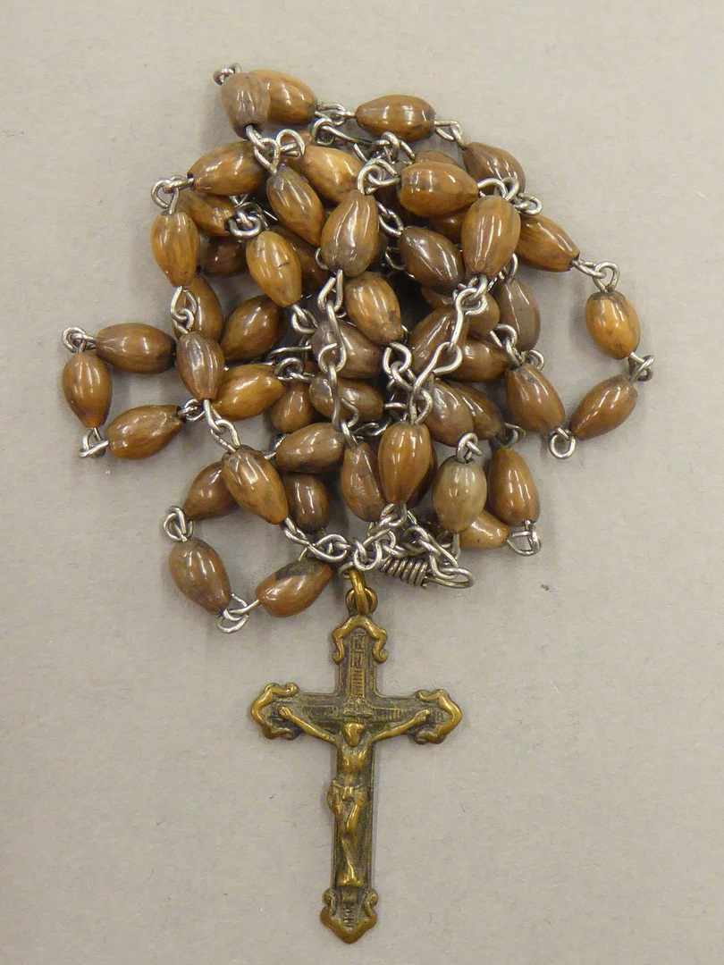 Rozenkrans van bruine pitten met messing kruisje