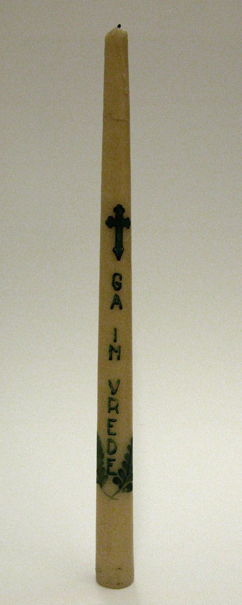 Doopkaars van Bernardus Cornelis Schilt, met groen kruisje waaronder "Ga in vrede"