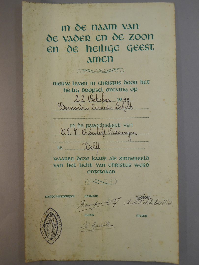 Doopcertificaat van Bernardus Cornelis Schilt, behorend bij RMCC v373a