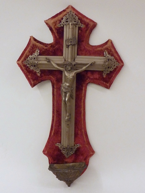 Kruisbeeld met corpus op met rood beklede drager, aan voet wijwaterbak