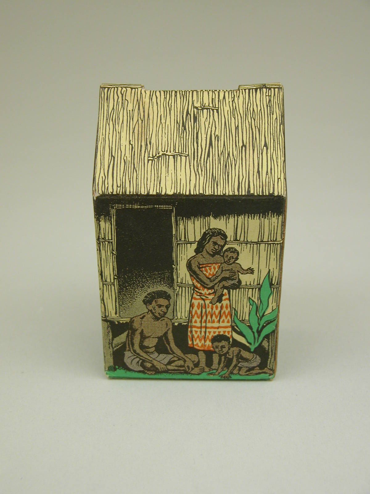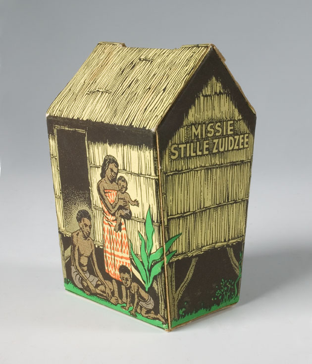 Missiebus in vorm van rieten hut, met "Missie Stille Zuidzee" en "Paters Maristen"