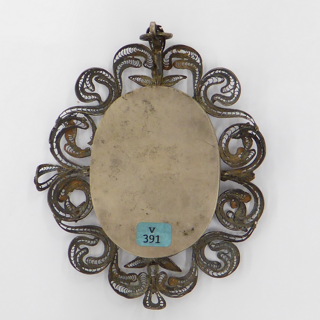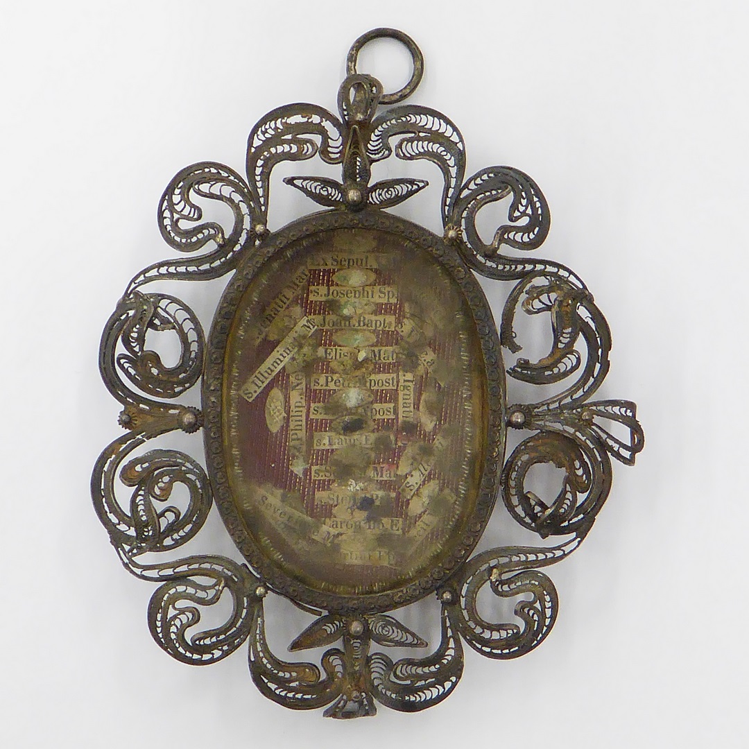 Reliekmedaillon omgeven door filigraan met relieken van 21 heiligen