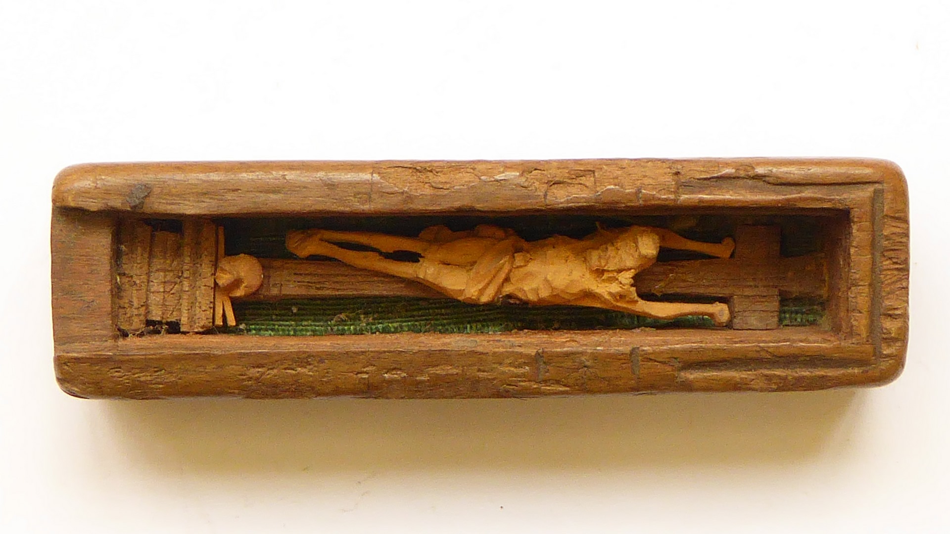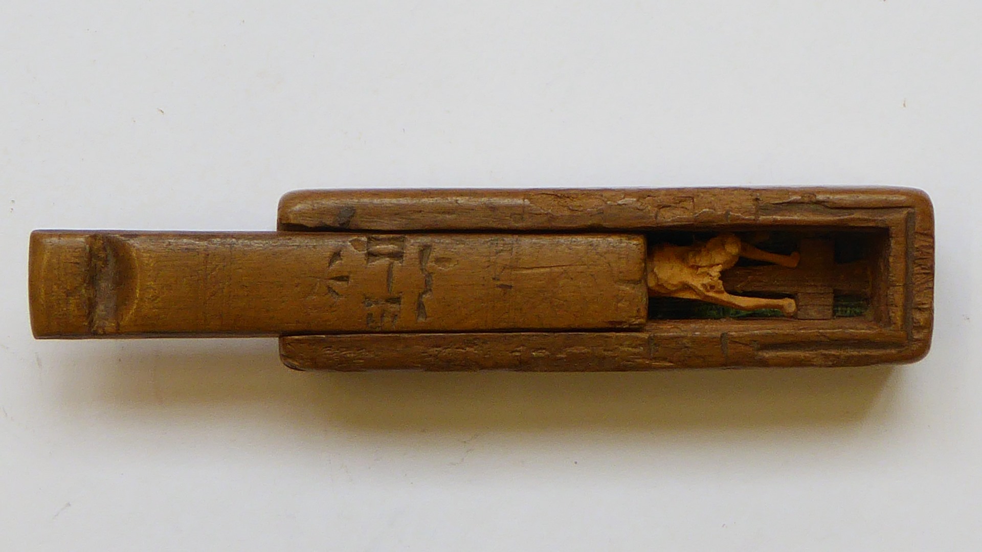 Zakheiligdom in vorm van doosje met schuifdeksel met IHS waarin gekruisigde Christus