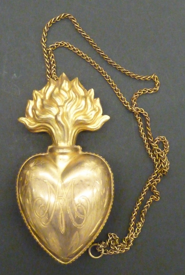 Heilig Hart van Maria in vorm van hol koperen hart met deksel, aan ketting
