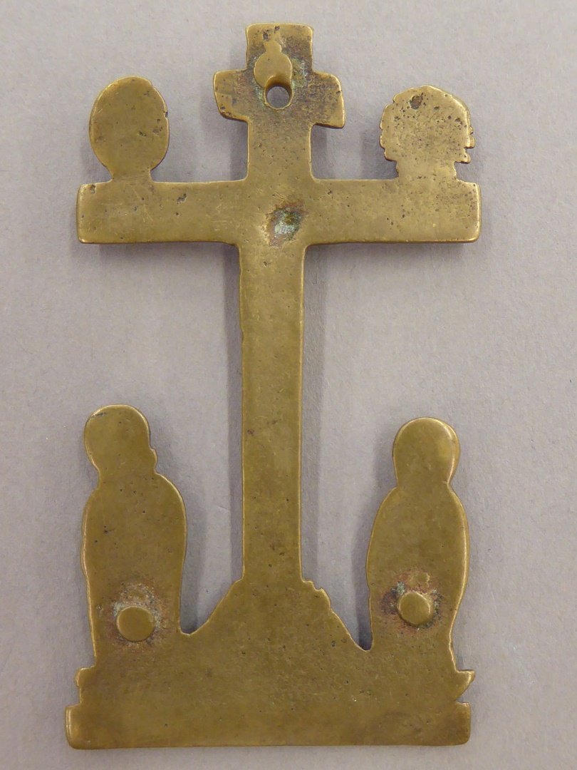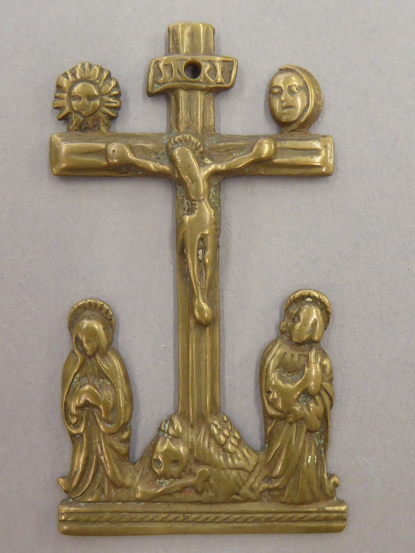 Kruisje met corpus, zon en maan, aan de voet Maria en Johannes