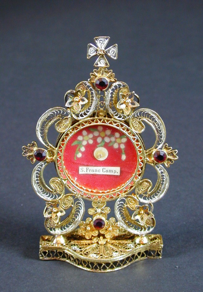 Staande reliekhouder met goud- en zilverkleurig filigraan met reliek van H. Franciscus Camp.