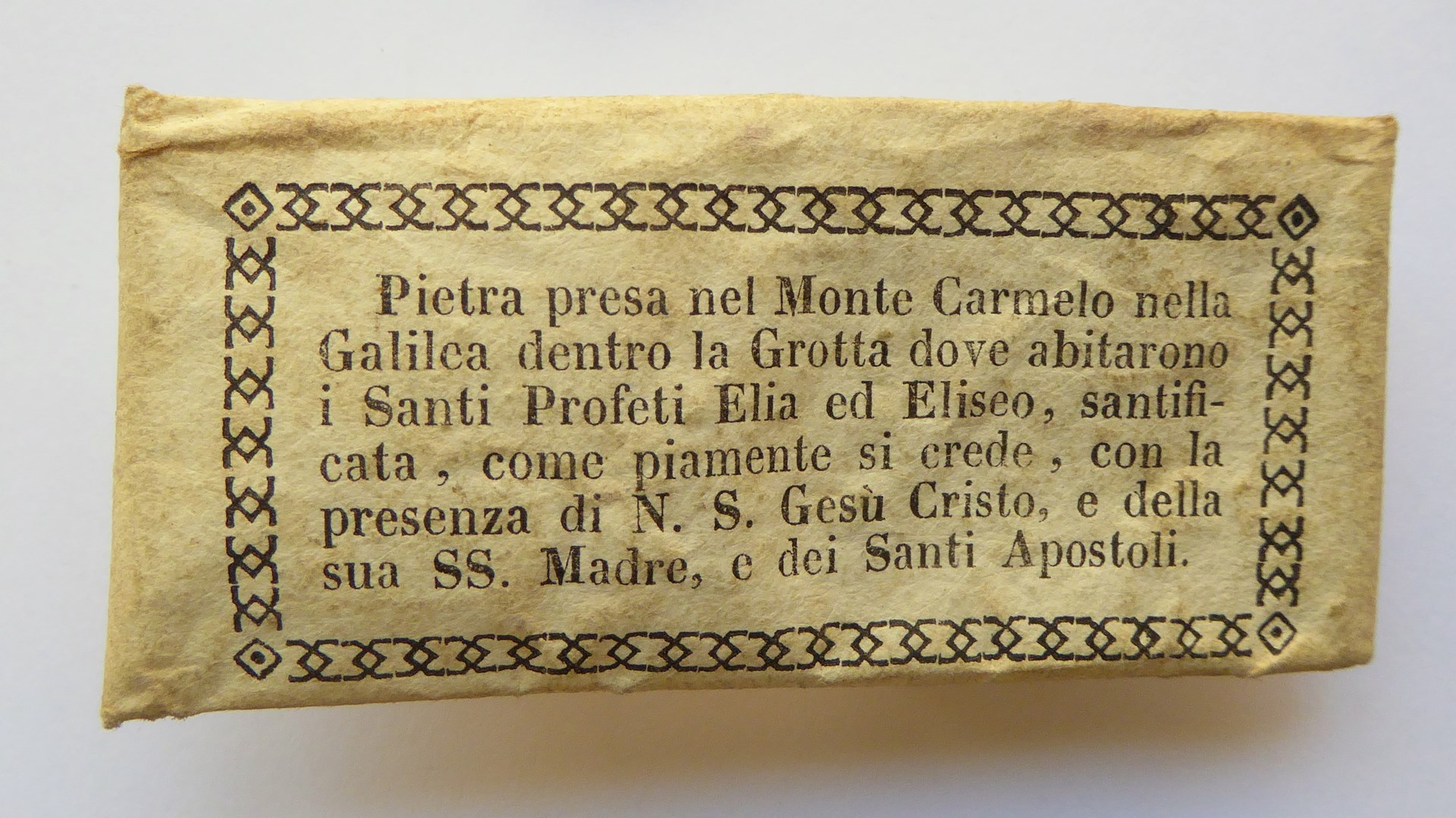 Steentjes uit grot van HH. Elias en Eliseus op de berg Karmel met verklaring