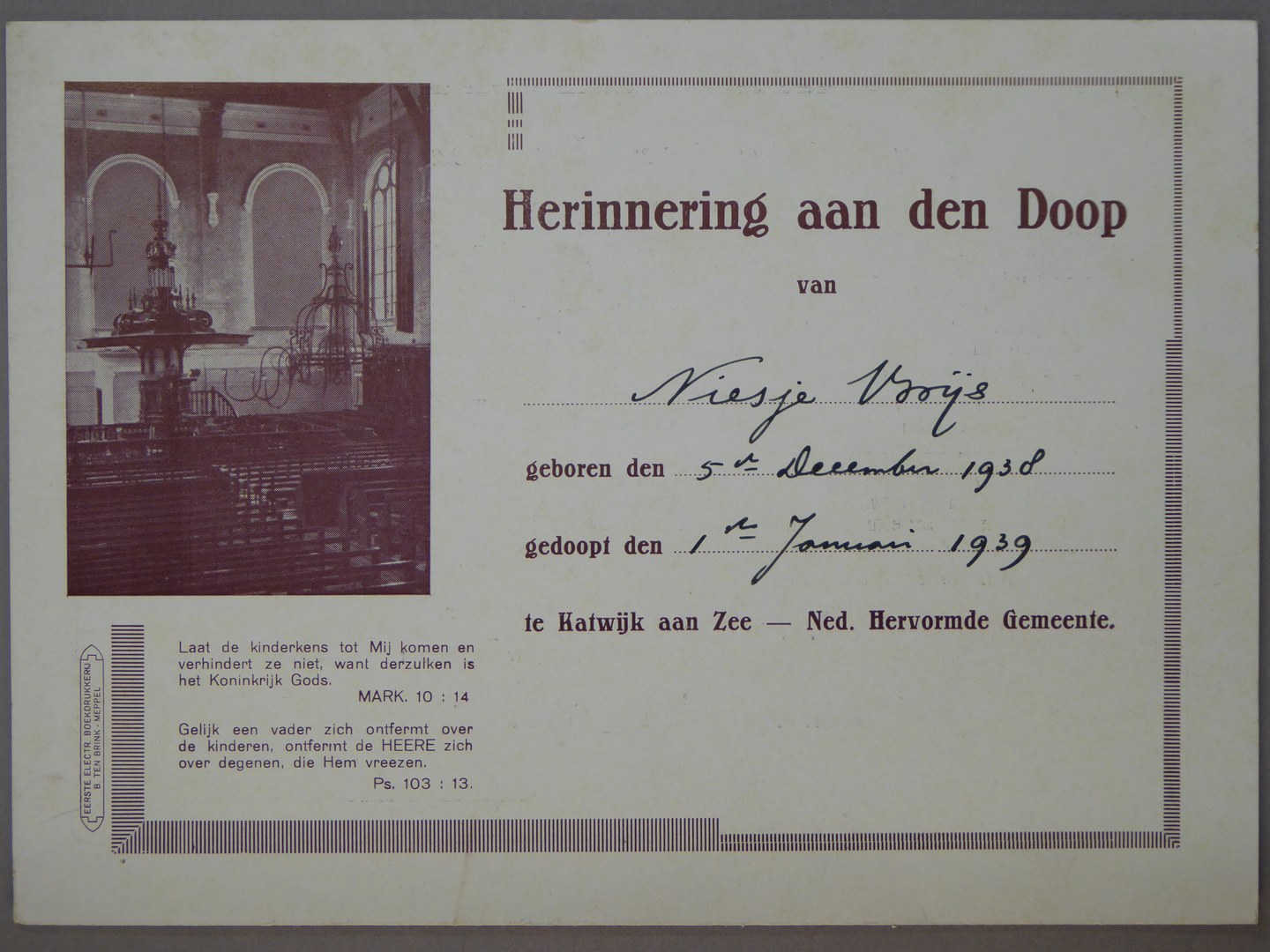 Doopherinnering van Niesje Vooijs in de N.H. kerk te Katwijk aan Zee