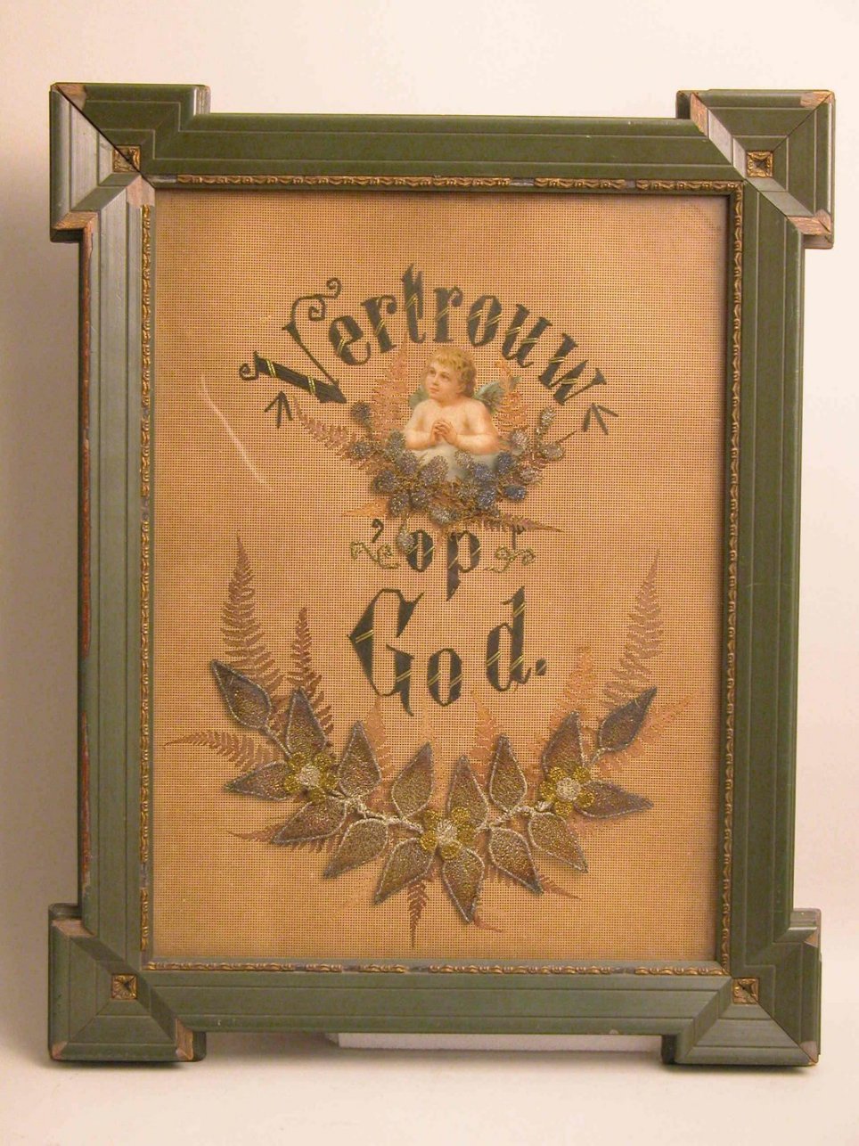 Borduursel in groene lijst met "Vertrouw op God"