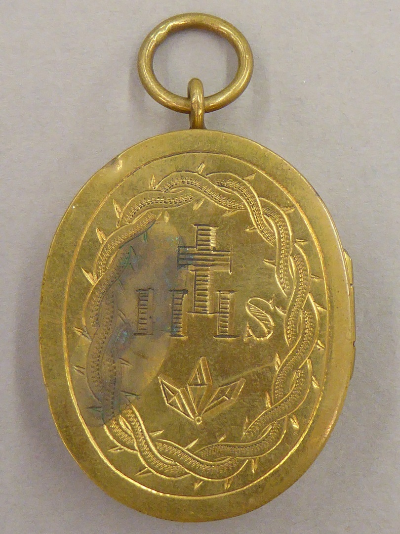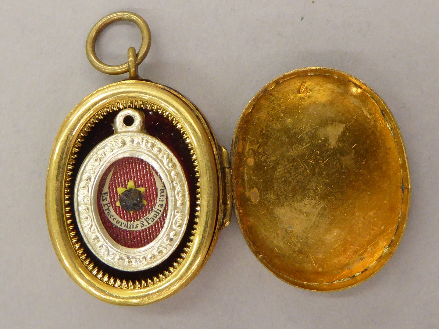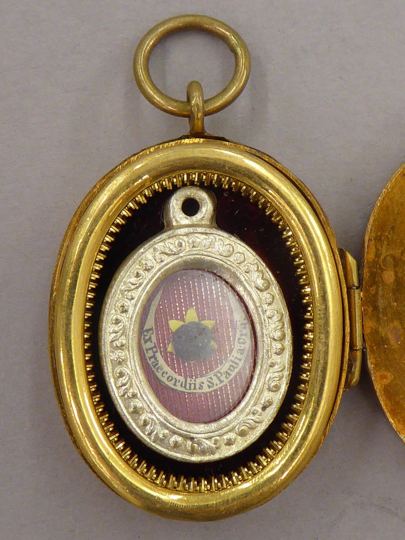 Reliekmedaillon met deksel waarop IHS en reliek H. Paulus