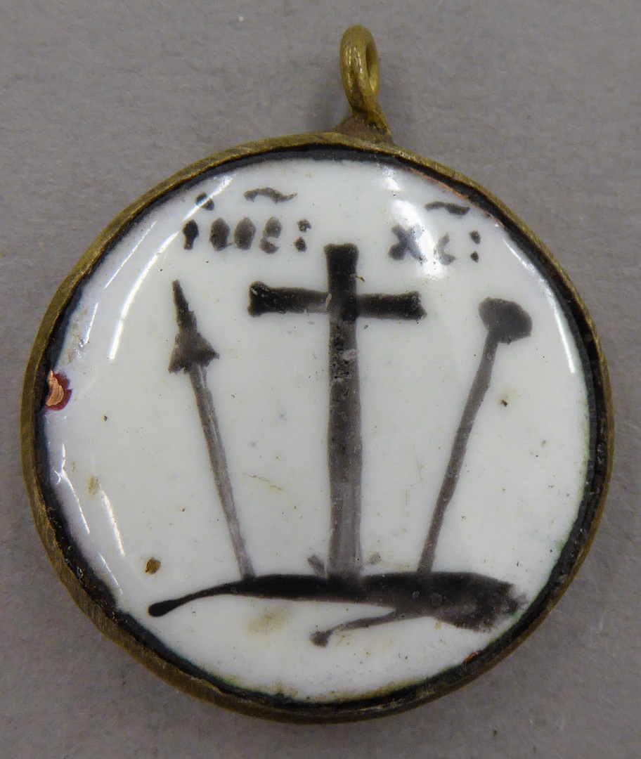 Medaillon met Griekse kerk, achterzijde lijdenswerktuigen