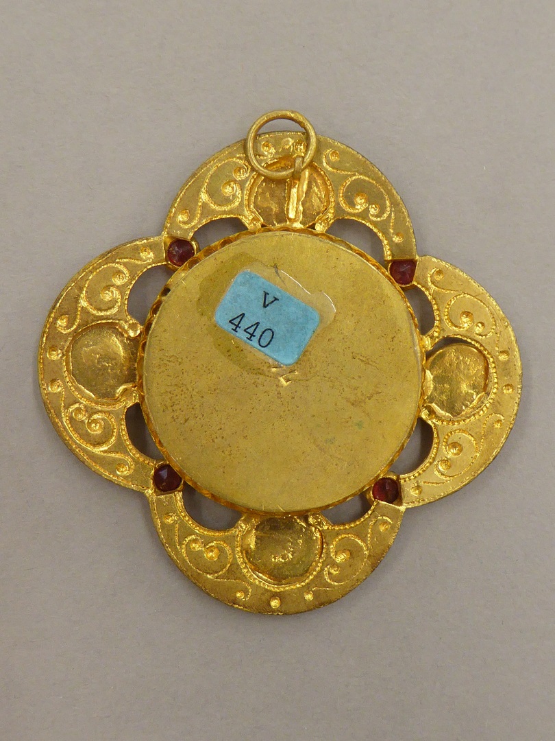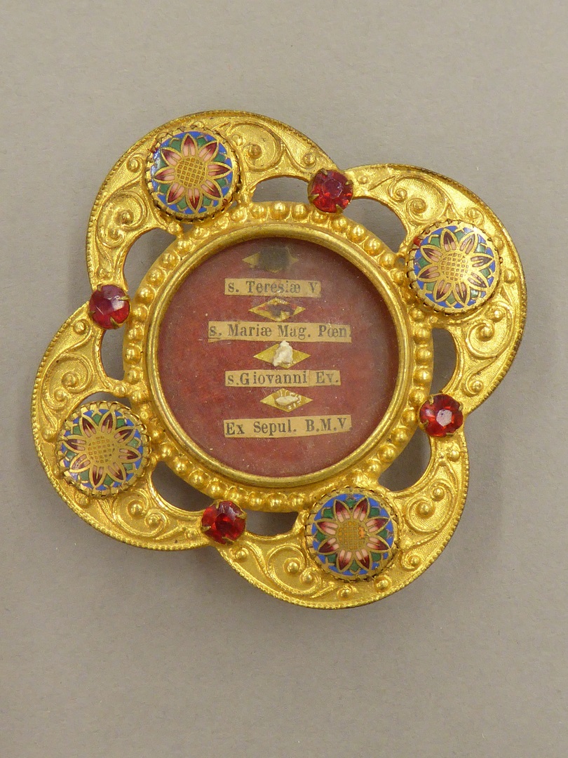 Goudkleurige reliekhouder ingelegd met email en glas, met reliek van o.a. H. Theresia