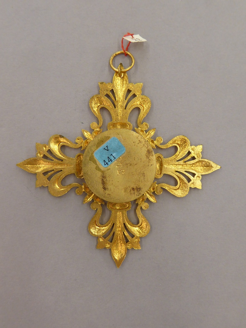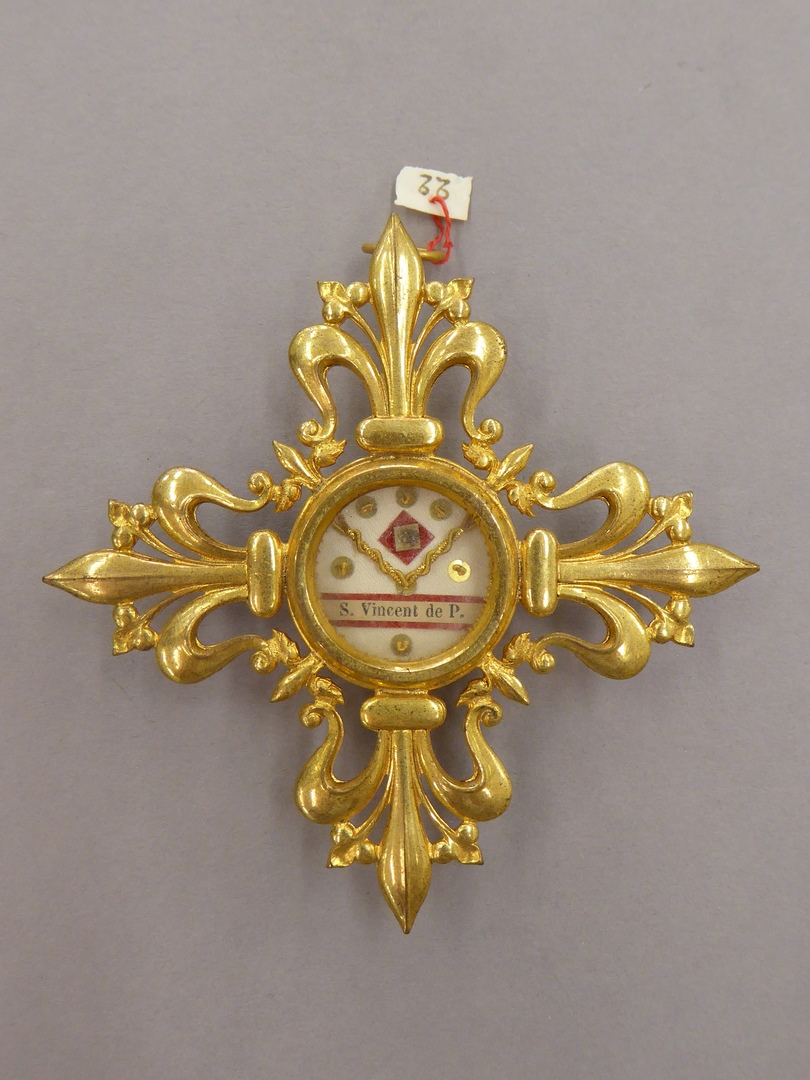 Reliekhouder omgeven door rand van vier lelies met reliek St. Vincentius a Paolo