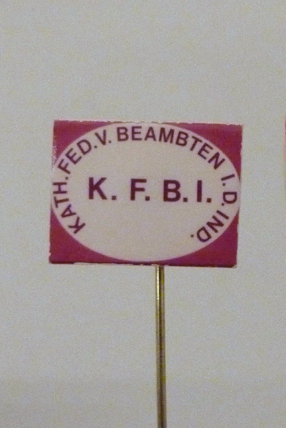 Speldje, wit met rode letters "Kath. Fed. v. Beambten i.d. Ind." (KFBI)