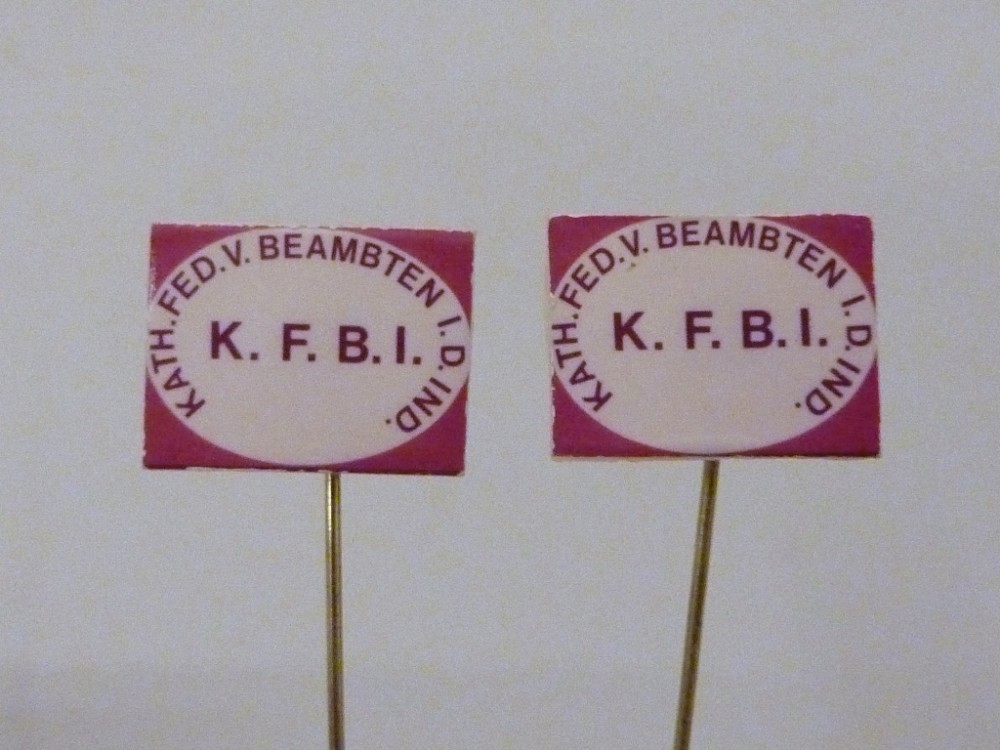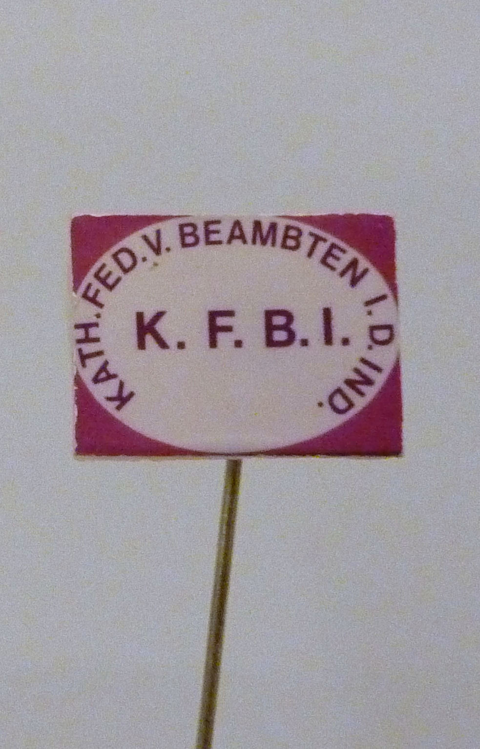 Speldje, wit met rode letters "Kath. Fed. v. Beambten i.d. Ind." (KFBI)