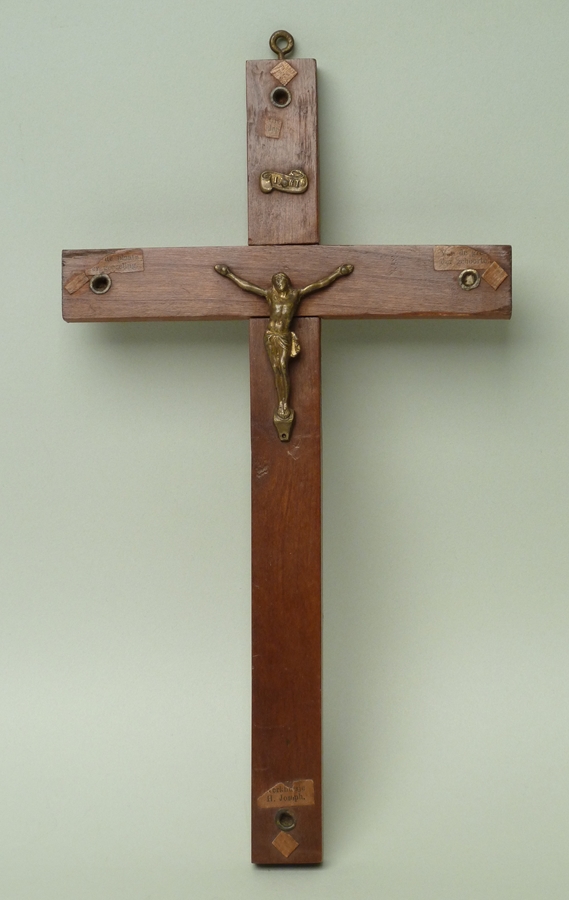 Bruin houten kruis met corpus en relieken van o.a. geboortegrot en geselplaats
