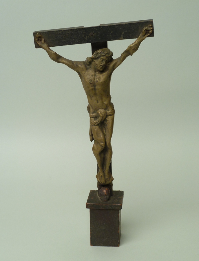 Zwartgeverfd kruis met gestanst corpus, doodshoofd onder voeten, bovenstuk kruis ontbreekt