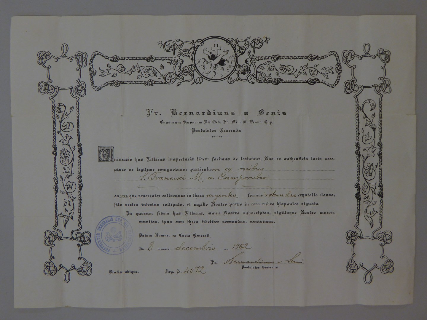 Echtheidsverklaring bij (ontbrekend) reliek van H. Franciscus Maria Camporubeo (Camporosso)