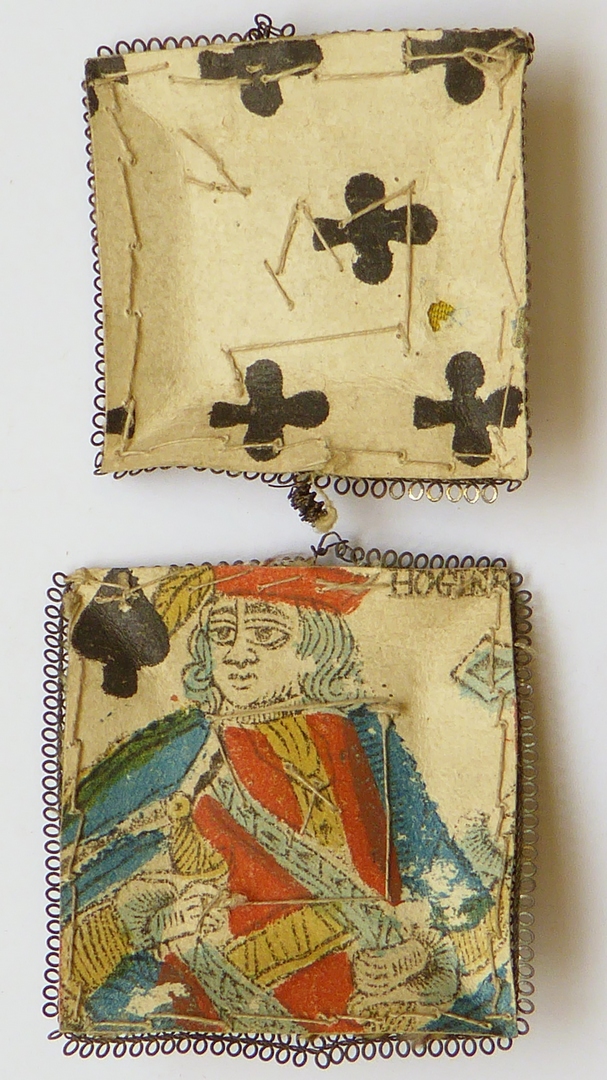 Vierkante reliekhouder(?) in twee stukken gemaakt uit speelkaarten waarop twee kleine relieken