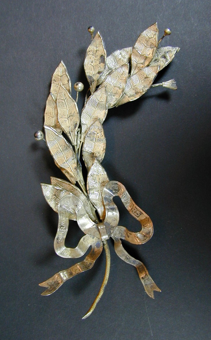 Fanfareconcours 1e prijs 's Graveland: zilveren eiketak met strik om aan vaandel te bevestigen